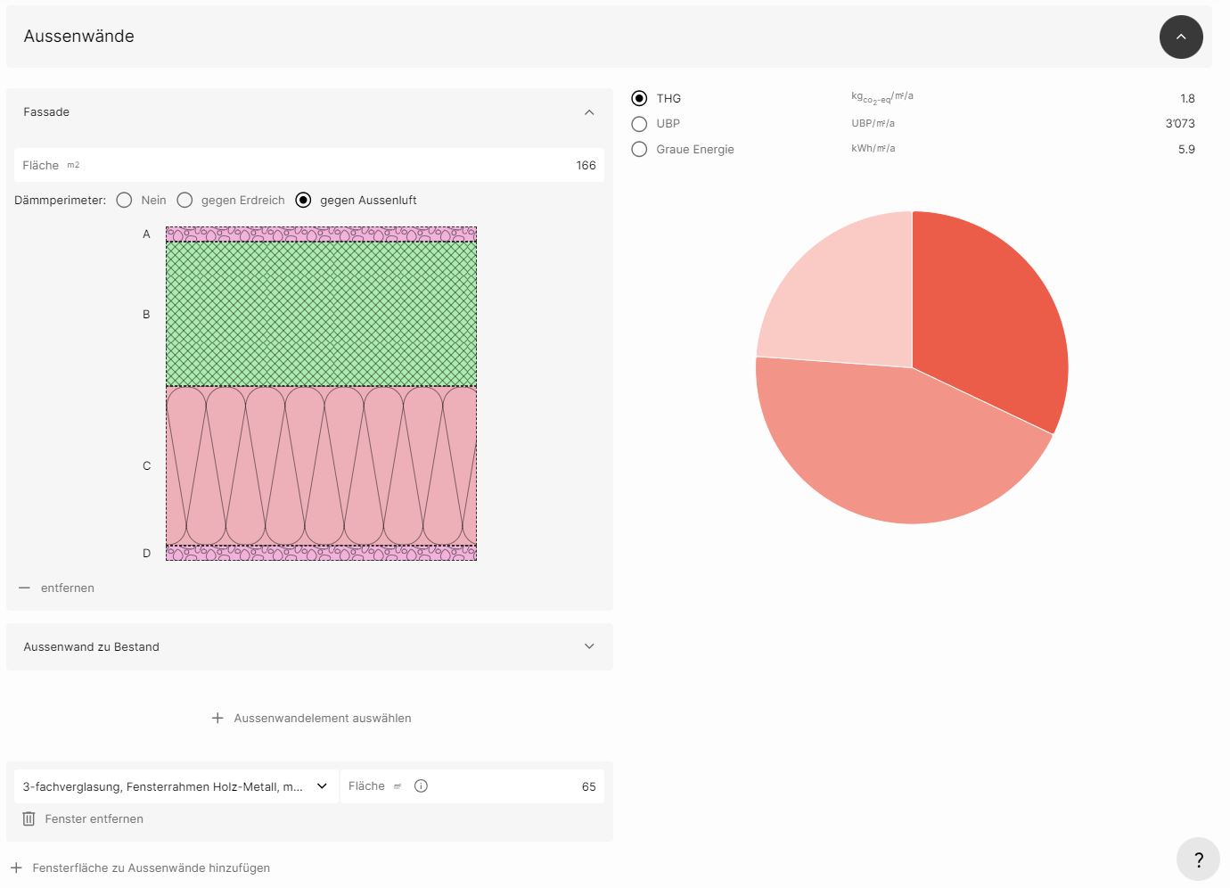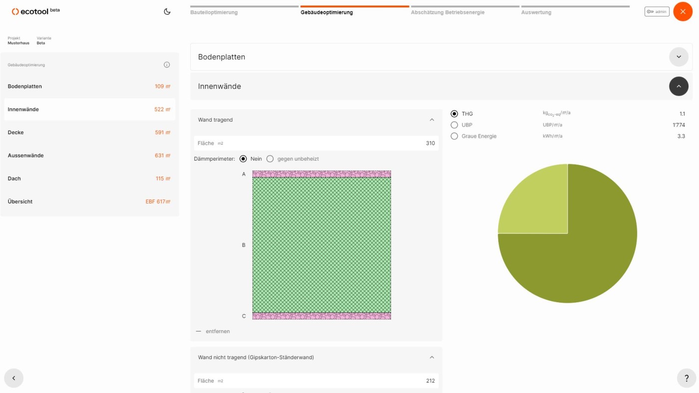 Nachdem du die Aufbauten gewählt hast, kannst du die dazugehörigen Bauteilflächen in deinem Projekt eingeben. Im jeweiligen Segment (hier Innenwände) siehst du nach der Eingabe der Bauteilflächen, welchen Anteil welches Bauteil an der Ökobilanz der Innenwände hat. Du kannst die Messgrösse der Grafik von THG auf UBP oder Graue Energie wechseln, indem du das entsprechende Feld anklickst.