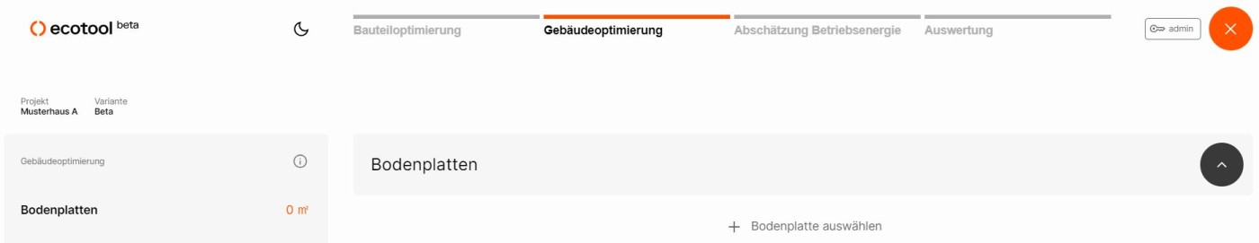 Im zweiten Schritt "Gebäudeoptimierung" greifst du deine Bauteilaufbauten vom ersten Schritt auf und ergänzt sie mit einer Flächenangabe. Die Gliederung in Bodenplatten, Innenwände, Decken, Aussenwände und Dach bleibt bestehen. Über das + Symbol kannst du jeweils die Aufbauten auswählen, welche du in der Gebäudeoptimierung benötigst.