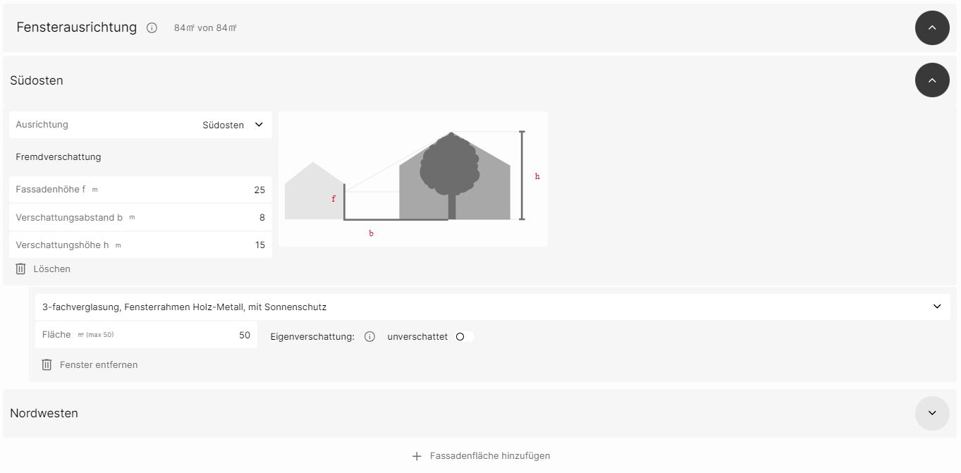 Für jede Hausseite kannst du eine Fremverschattung definieren, falls eine vorliegt. Die Fassadenhöhe f stammt von deinem Projekt. Die Verschattungshöhe h gehört dem Verschattungsobjekt an (Gebäude oder Vegetation), gib hier den höchsten Punkt des Objekts an. Der Verschattungsabstand b definiert den Abstand von deiner Fassade bis zum höchsten Punkt des Verschattungsobjekt. Gib nun noch die Fensterfläche ein und ob es sich um unverschattete oder teilverschattete Fenster handelt. Wiederhole dieses Vorgehen für alle Fassadenseiten über den Button "+ Fassadenfläche hinzufügen" .