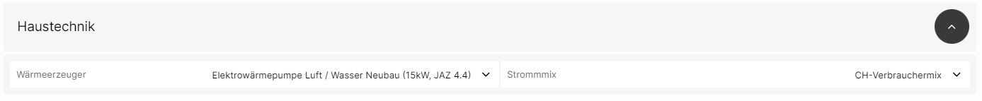 Im Ausklapper Haustechnik machst du über zwei Dropdowns Angaben zum Wärmeerzeuger und zum am Projektstandort vorliegenden Strommix.