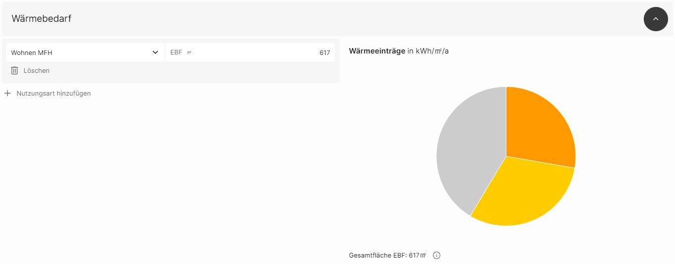 Der Wärmebedarf wird über die Raumnutzung abgeschätzt. Mit "+ Raumnutzung hinzufügen" kannst du die verschiedenen Nutzungsarten in deinem Gebäude erfassen. Die Auswahl der Nutzungen ist über das Dropdown anwählbar. Zu jeder Raumnutzung wird die entsprechende EBF angegeben. Achte darauf, dass die Summe der eingegebenen EBF mit der aus der Gebäudeoptimierung übereinstimmt. Falls du in der Projektverwaltung eine andere Bezugsgrösse gewählt hast (GF oder HNF), musst du die entsprechenden Flächen ebenfalls eintragen.